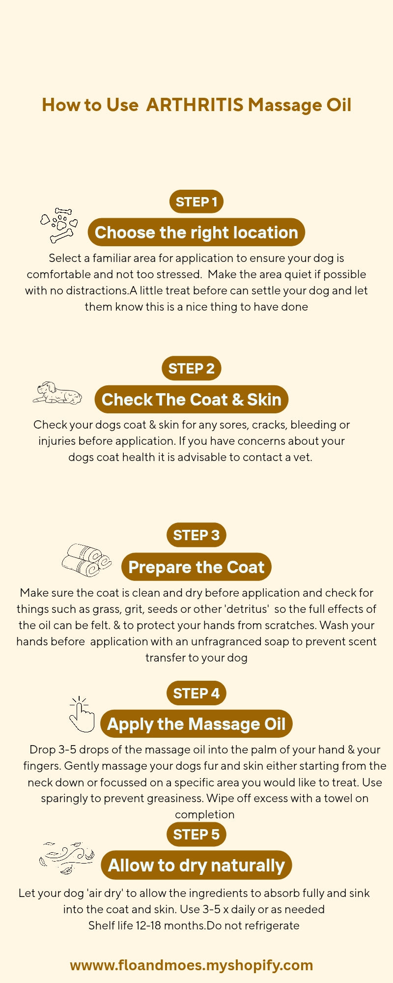 Our ARTHRITIS CARE MASSAGE OIL is specifically formulated to help support your animals condition. Formulated from essential oils known for their effectiveness and mixed with carrier oils infused with natural herbs and florals chosen for their anti- inflammatory and analgesic properties, our oil can be applied topically 3-4 x daily on and around the affected areas to help your dog maintain the quality of life it deserves.