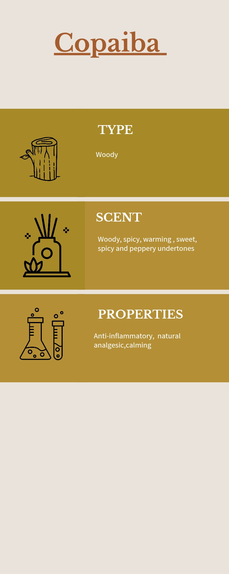 Copaiba EO - Woody Aromatic - a natural pain killer with excellent anti-inflammatory properties and a commonly used EO in medicinal soaps, washes and creams