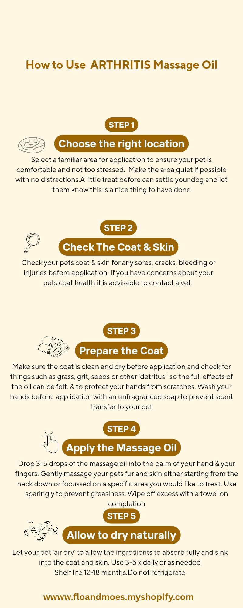 Our ARTHRITIS CARE MASSAGE OIL is specifically formulated to help support your animals condition. Formulated from essential oils known for their effectiveness and mixed with carrier oils infused with natural herbs and florals chosen for their anti- inflammatory and analgesic properties, our oil can be applied topically 3-4 x daily on and around the affected areas to help your dog maintain the quality of life it deserves.