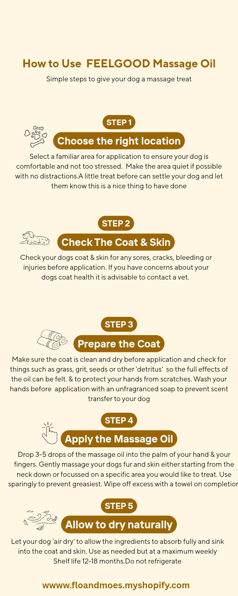 Our MASSAGE OIL (30ml dropper bottle) is made with fractionated coconut oil and gently scented with Ylang Ylang,Clary Sage & Chamomile a few drops onto your hands and rubbed into your dogs fur will help to relax them and you