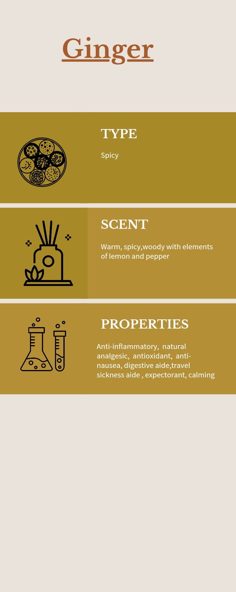 Ginger EO - Spicey Aromatic - known for its calming, soothing and relaxing and anti-microbial, anti-inflammatory, anti-spasmodic and digestive support properties