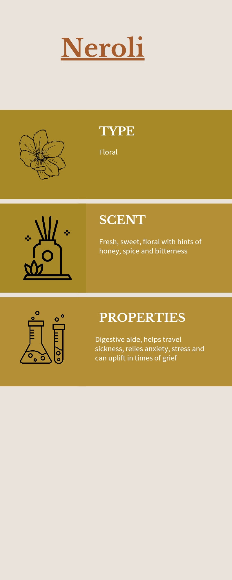 Neroli EO - Woody Aromatic - known for its calming, soothing and relaxing and anti-microbial, anti-inflammatory, anti-spasmodic and digestive support properties